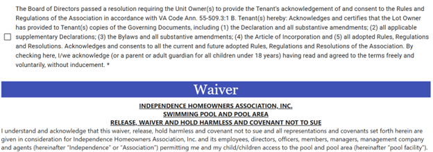 To maintain current records and compliance, the HOA uses automated expiration management, setting all memberships to expire yearly in December. The renewal process requires residents to digitally agree to rules and sign the waiver within the application, automatically collecting and merging the signed legal document for annual acceptance of liability terms.