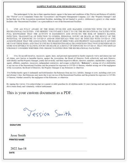 Fields are marked on the pool application as a “merged field”. Usually, these are all the fields in the Waiver section. These fields are then combined into a separate document. Usually called The Waiver.
